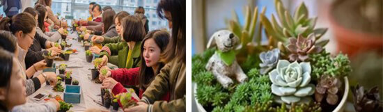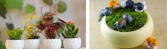 微景观绿植是将苔藓、蕨类等观叶植物等生长习性相近的植物, 再加上多肉植 物,搭配上各种造景小玩偶、石头、枯木等,运用美学的构图原则以微缩、精 致的方式呈现出来的微缩景观。