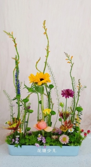 斑斓的色彩+ +丰沛的热情+ +饱满的创造力= =孩 子的世界。其实也是插花艺术的世界。 当孩子遇到花朵时会忍不往惊奇、微笑、摸、 嗅、感、修、剪、插,会触发孩子的触觉、 运动、观察、创意。
